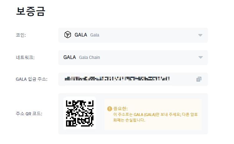 갈라체인 네트워크를 선택하면 아래와 같이 입금주소가 뜹니다.