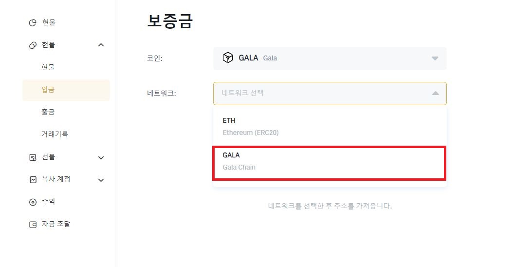 이제는 갈라체인(gala chain) 네트워크를 이용해서 입급하겠습니다.