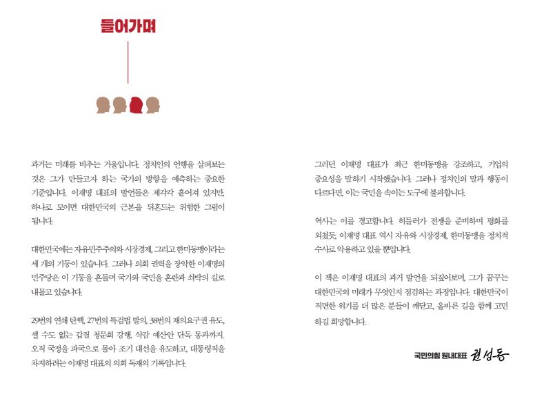 '이재명 망언집'은 국민의 힘 공식 홈페이지룰 통해 무료로 제공되고 있습니다. 아래 안내대로 접속하시면 다운로드하여 열람하실 수 있습니다.