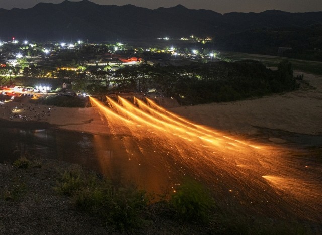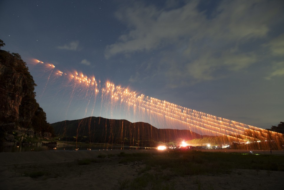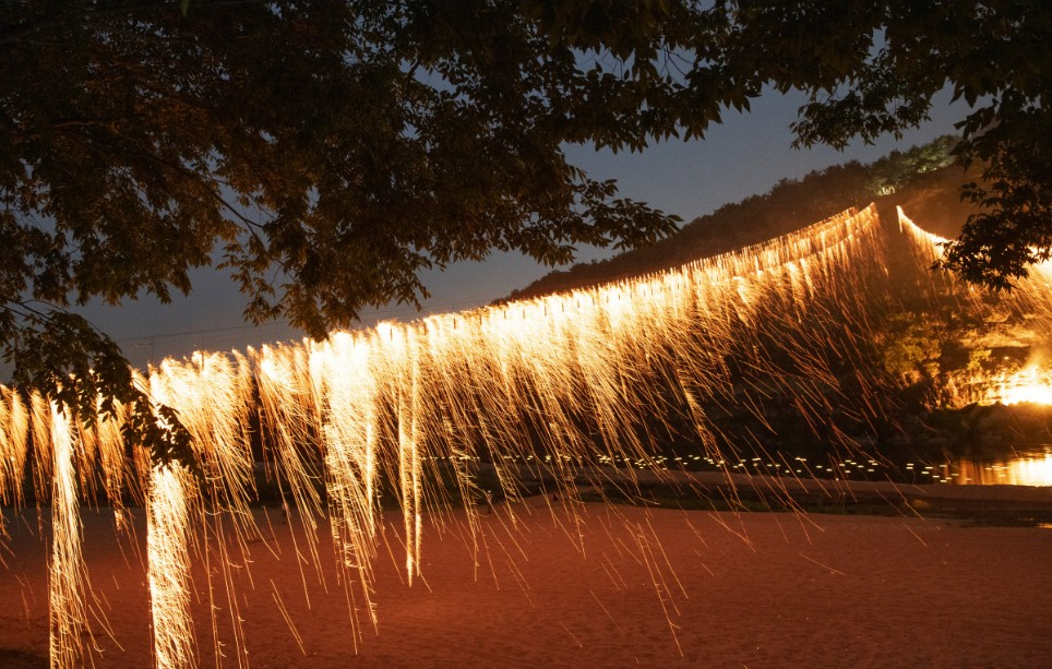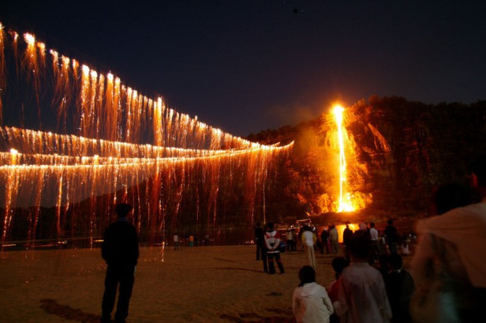 유네스코 세계유산으로 지정된 아름다운 하회마을에서 펼쳐지는 전통 불꽃놀이인데, 뽕나무 숯가루를 이용하여 은은한 불꽃이 아래로 흘러내리는 모습이 비처럼 흘러내려 강물과 어우러지는 모습이 정말 장관이라고 합니다.