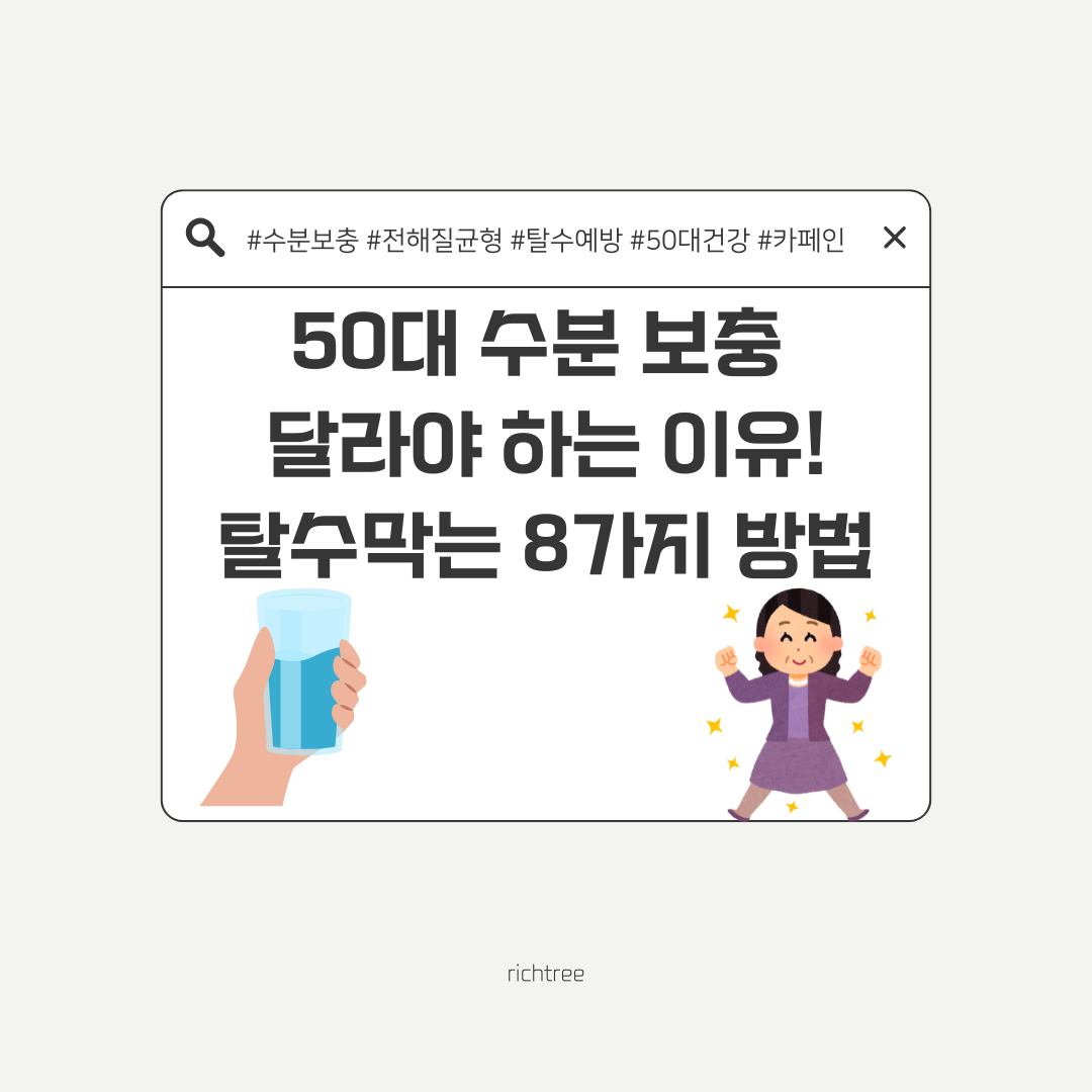 50대의 건강한 삶, 충분한 수분 섭취에서 시작됩니다! 오늘부터 8가지 수분 보충 전략을 실천하고, 건강하고 활기찬 삶을 누리세요! 수분 섭취와 관련된 추가 정보나 전문적인 상담이 필요한 경우 의료 전문가와 상담하는 것이 좋습니다. 더 건강하고 행복한 50대를 응원합니다!